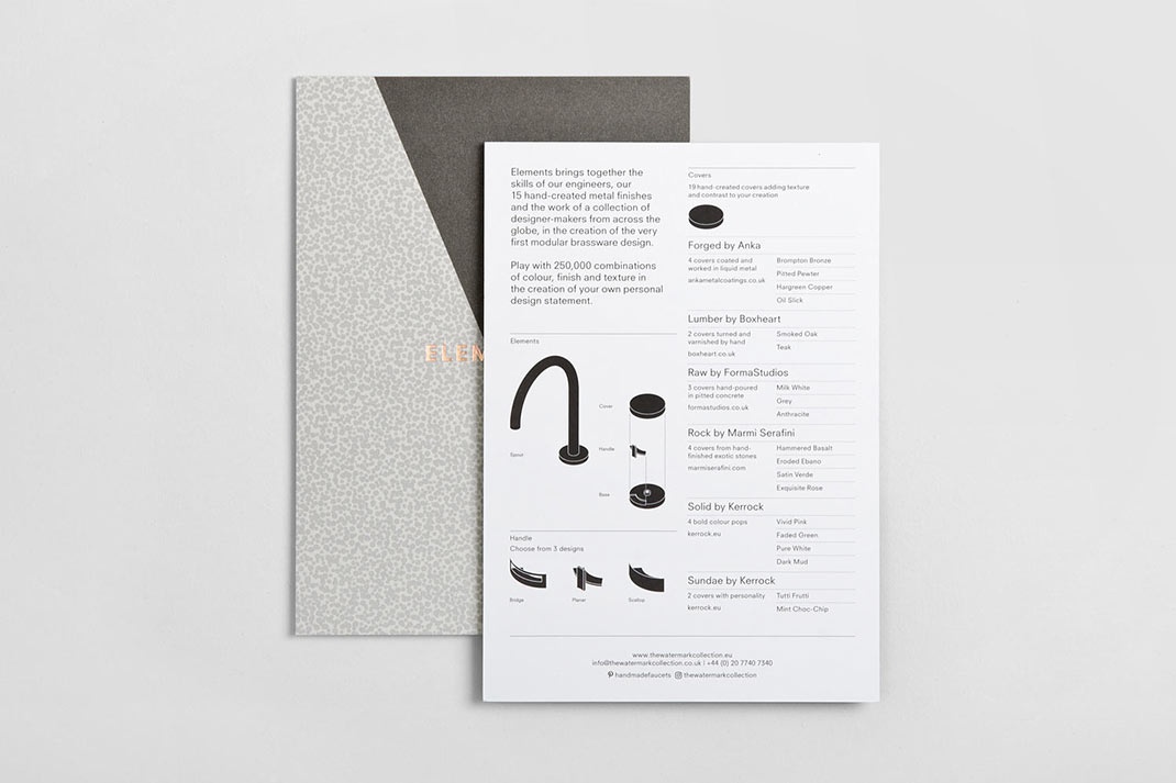元素是最新的噴口和處理范圍從布魯克林的精品銅器業(yè)務(wù),水印收集。它有15個(gè)金屬飾面,3個(gè)手柄設(shè)計(jì)和19個(gè)手工制作的封面。這些構(gòu)成了可能的25萬(wàn)種可能的組合。元素的模塊性、實(shí)質(zhì)性和多樣性被描繪出來(lái),并通過英國(guó)設(shè)計(jì)工作室DN&co創(chuàng)建的視覺標(biāo)識(shí)來(lái)表達(dá),然后在一系列獨(dú)特的小冊(cè)子封面上播放。